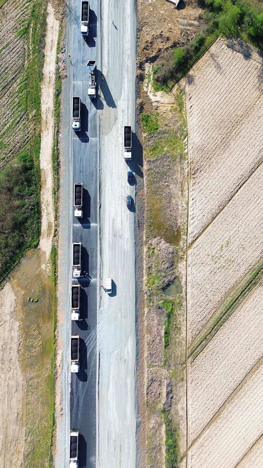 On the left (eastern) chainage side, the cement-stabilised load-bearing layer and the base asphalt course have been completed. On the right (western) chainage side, stone material has been delivered, graded and compacted for the construction of the cement-stabilised load-bearing layer, and work on this layer is now under way.